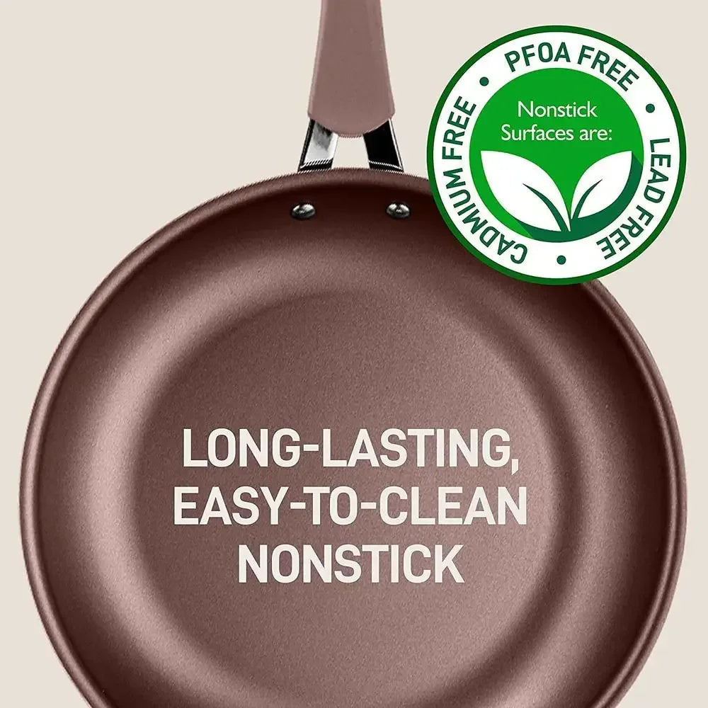 Upgrade your kitchen with the 14-Piece Aluminum Nonstick Cookware Set with Cool Touch Handles. Built from reinforced forged aluminum and finished in a sophisticated bronze, this set blends durable performance with modern style. The multi-layer coating delivers reliable nonstick performance, so food releases easily and cleanup is a breeze.