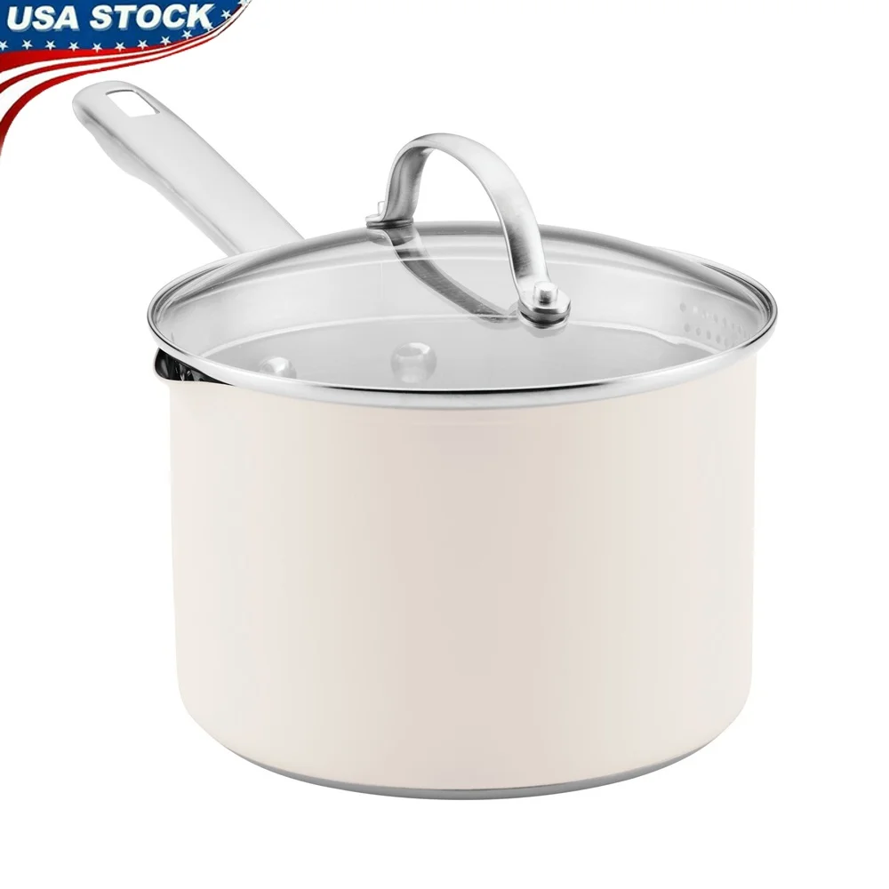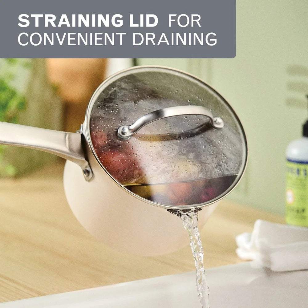 Luster 3-Quart Stainless Steel Straining Saucepan with Lid Dishwasher Safe Oven Safe Heat Conductive Aluminum Modern Cookware