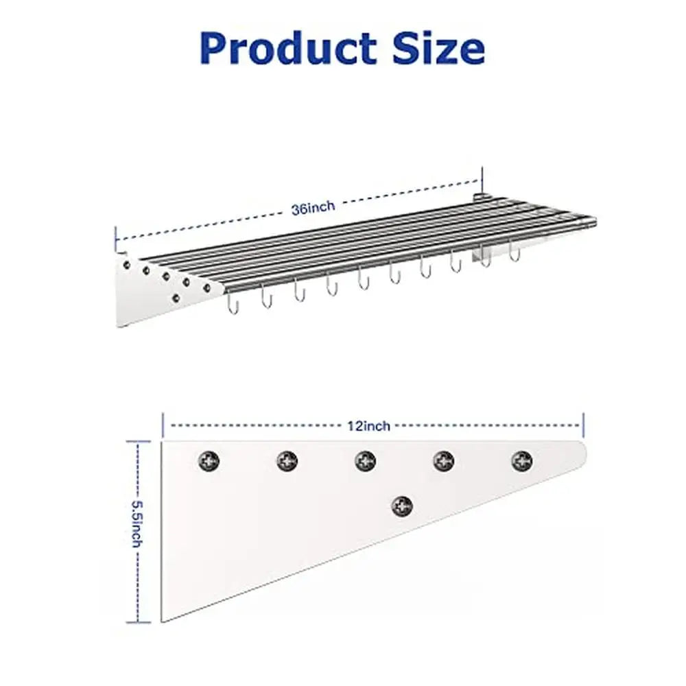 With generous storage capacity, the shelf dimensions are 12" D x 36" W x 5.5" H, supporting up to 165 lb of cookware, lids, and utensils. The design includes 10 removable S-hooks for customizable hanging and easy access to frequently used pots and pans.